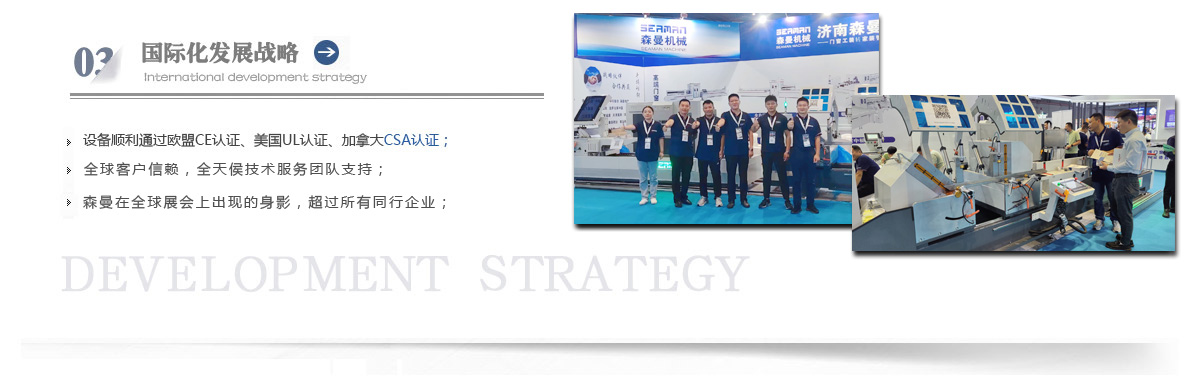 “森曼機械”作為全球門窗設備供應商,本著"seaman"精神,勇立潮頭,拼搏創新,以爭做行業為目標,在行業前輩發(fā)展的基礎上,努力學習,積極進取。目前公司產品涵蓋塑料門窗設備、鋁合金門窗設備、鋁幕墻設備、鋁木復合門窗設備及中空玻璃設備五大種類,近百個品種。公司產品銷售至全國各地及東南亞、非洲、東歐、北美等幾十個國家和地區。在這個競爭激烈的年代,我們正努力使我們的產品!